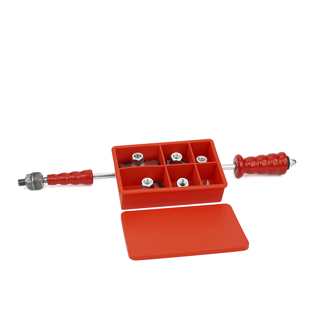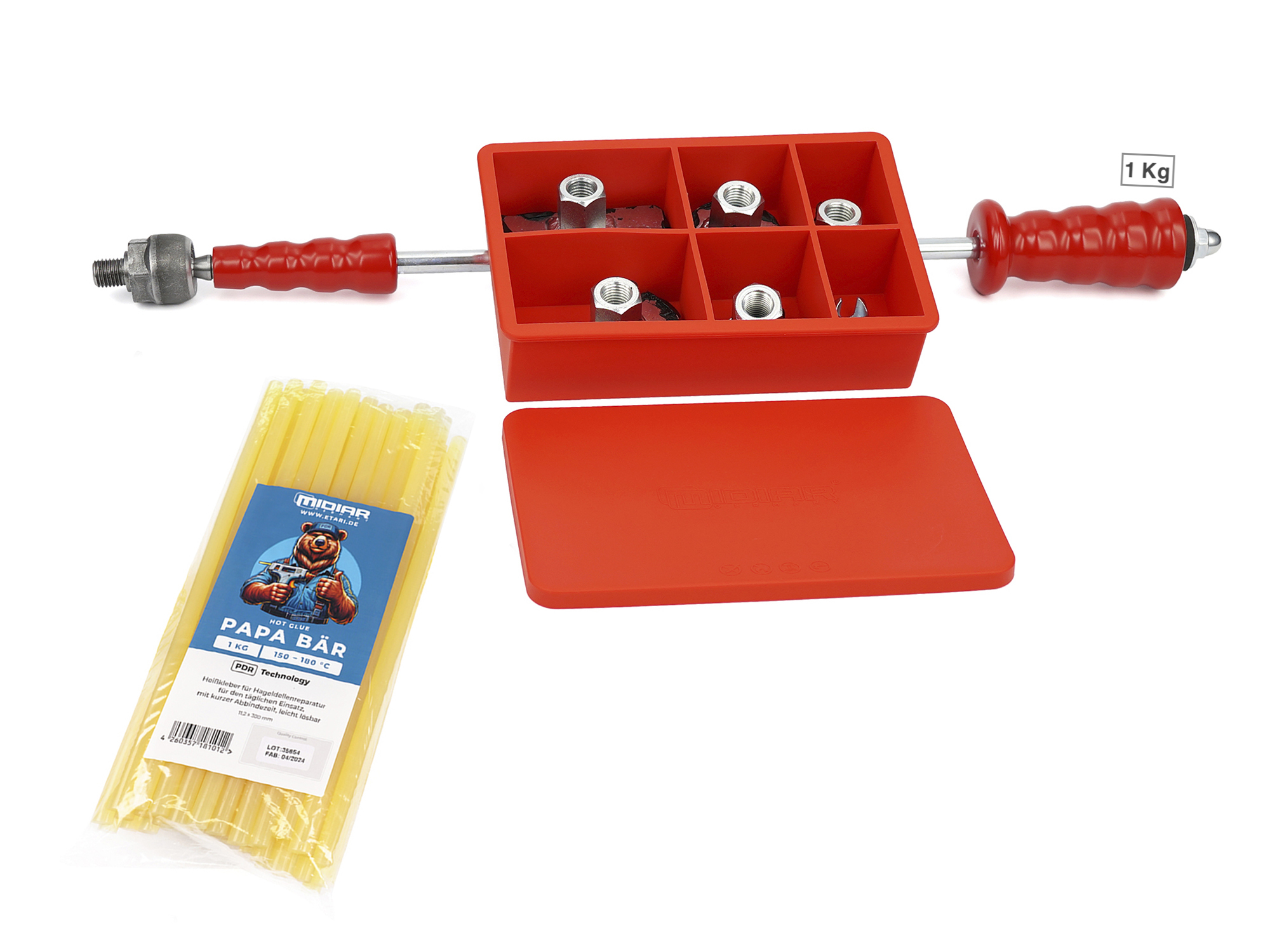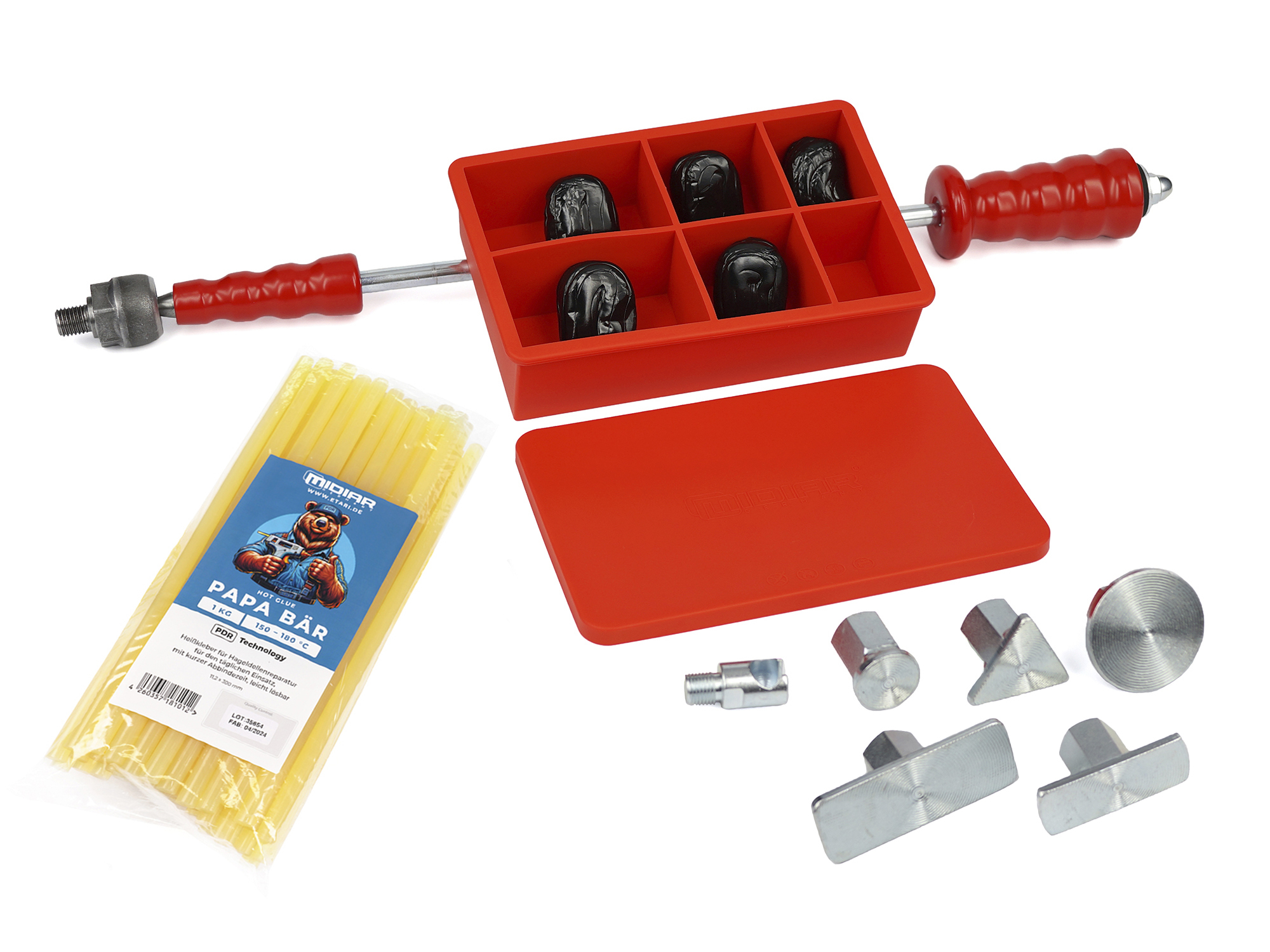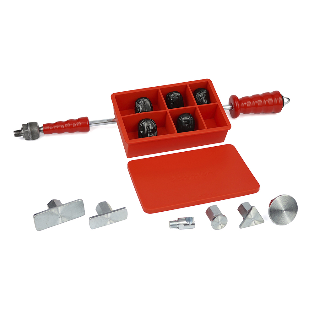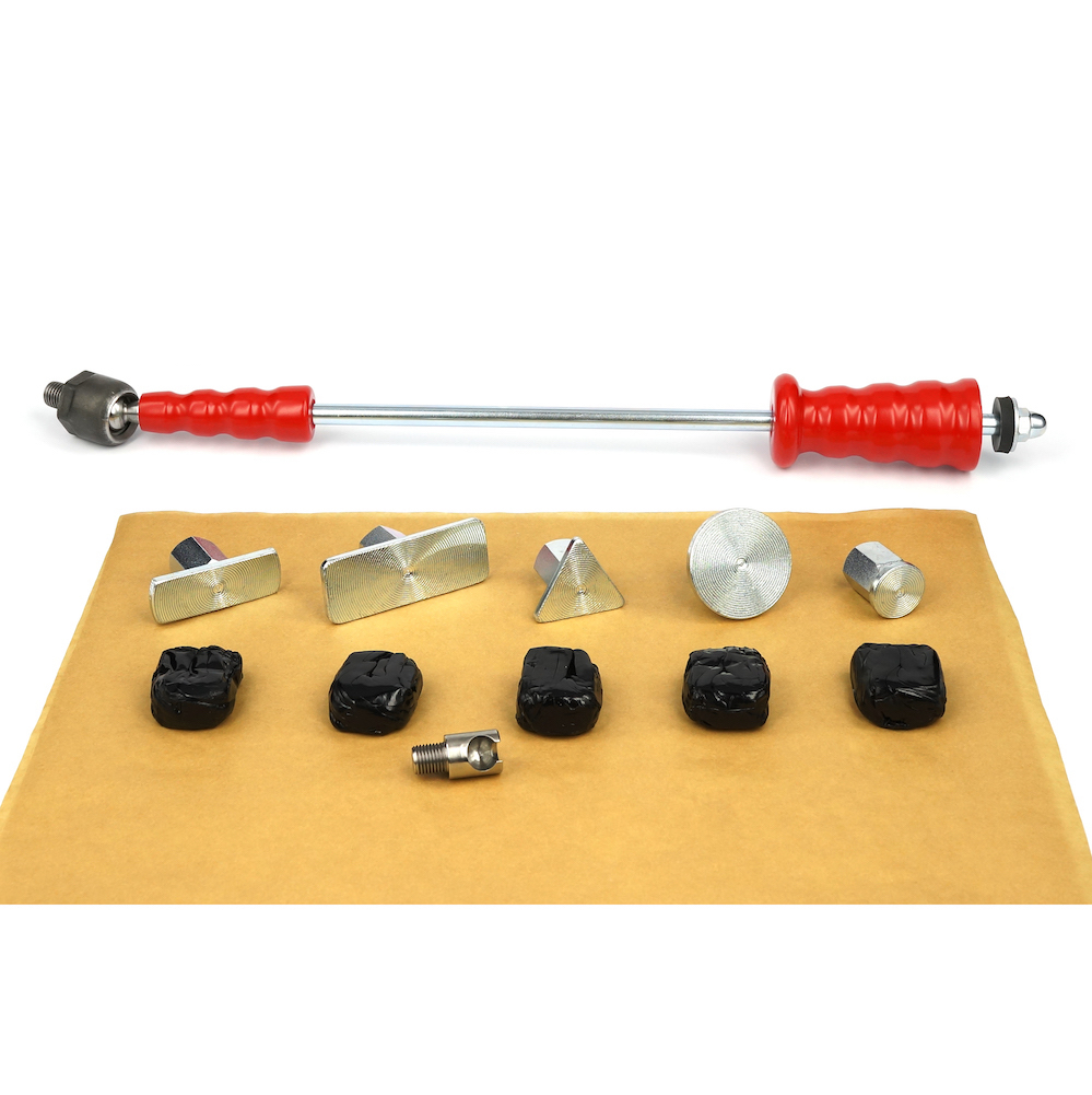 Der Zughammer bzw. Gleithammer inklusive schraubbare 5 x Klebstoffadapter und Kaltkleber Cola Fria als Dellenwerkzeug zum Arbeiten bei großen Schäden.