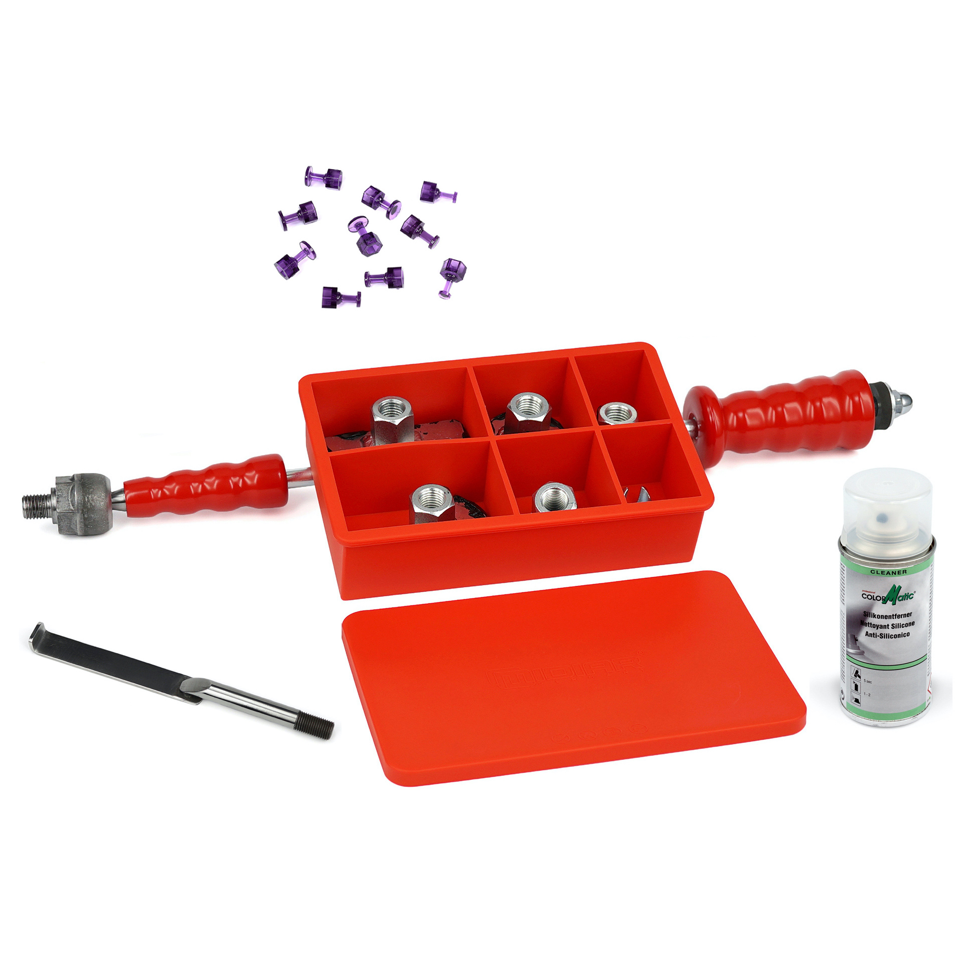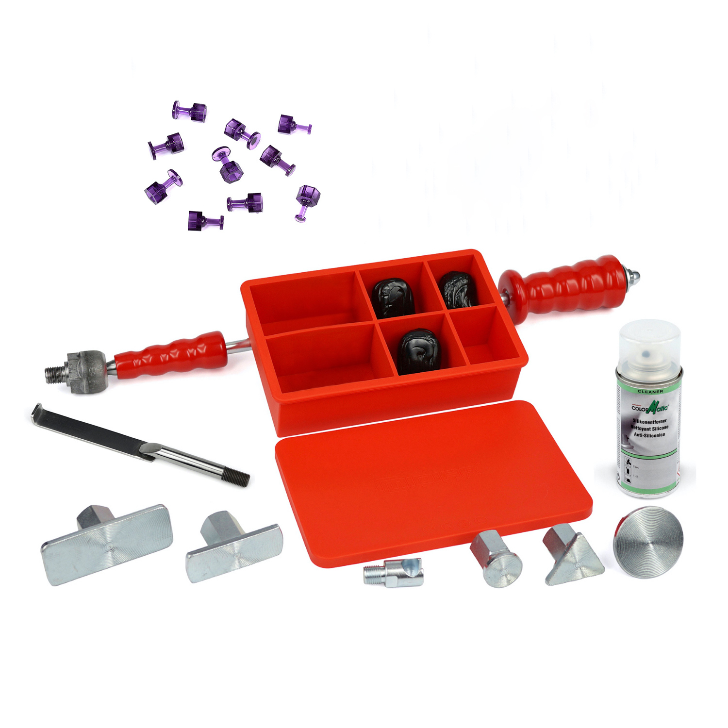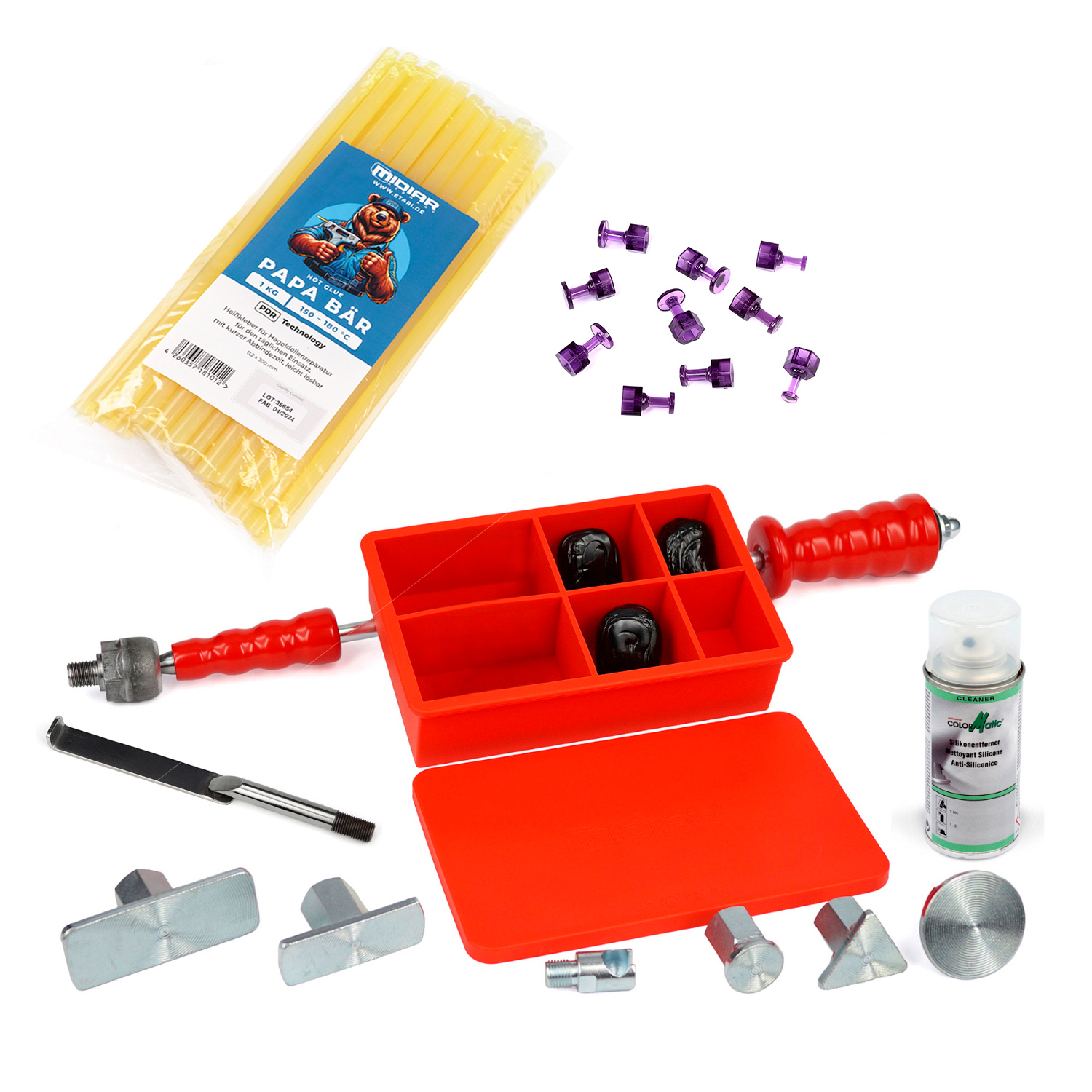 Der Zughammer bzw. Gleithammer inklusive schraubbare 5 x Klebstoffadapter und Kaltkleber Cola Fria als Dellenwerkzeug zum Arbeiten bei großen Schäden.